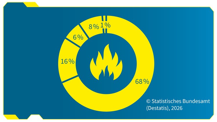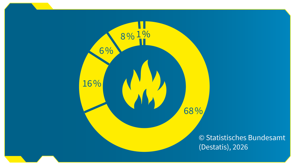 Raumwärme 68 %, Warmwasser 16 %, Sonstige Prozesswärme 6 %, Sonstiger Betrieb von Elektrogeräten 8 %, Beleuchtung 1 %.