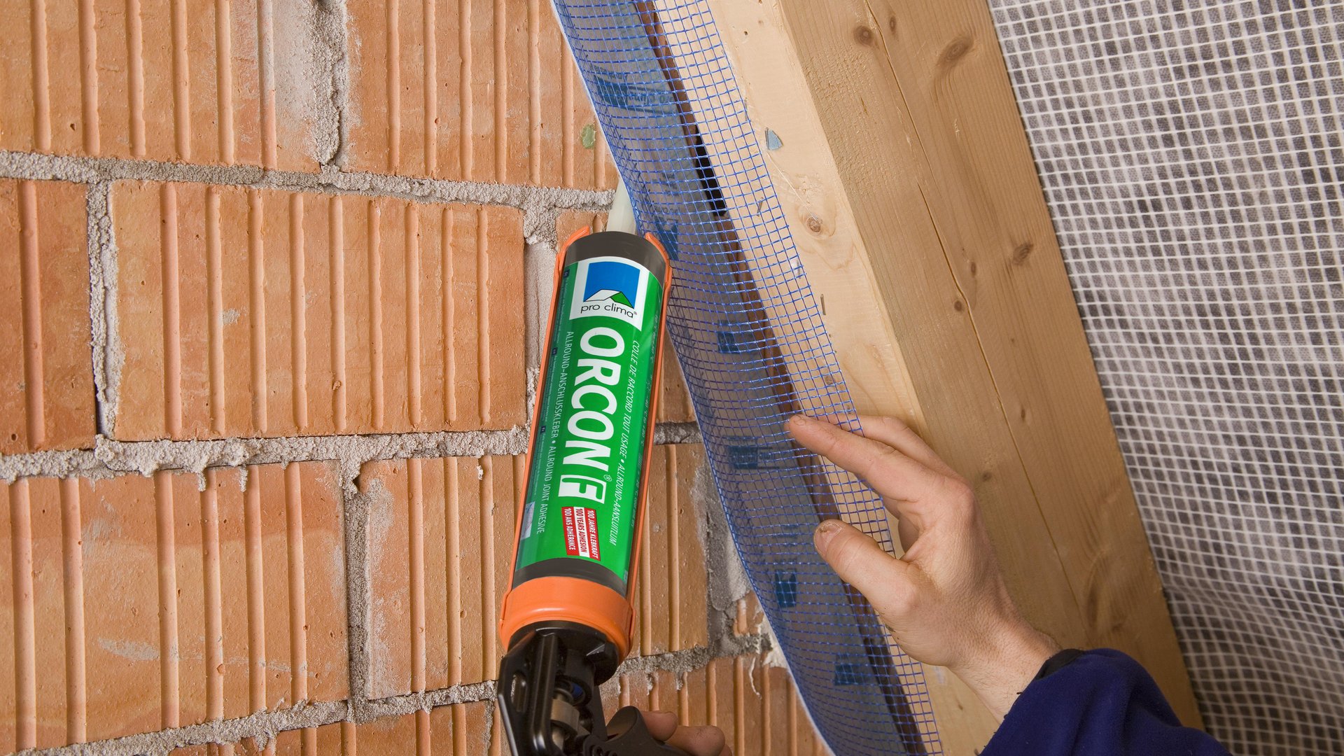 Putzanschlussband CONTEGA PV mit ORCON F an der Wand punktuell vorfixieren.