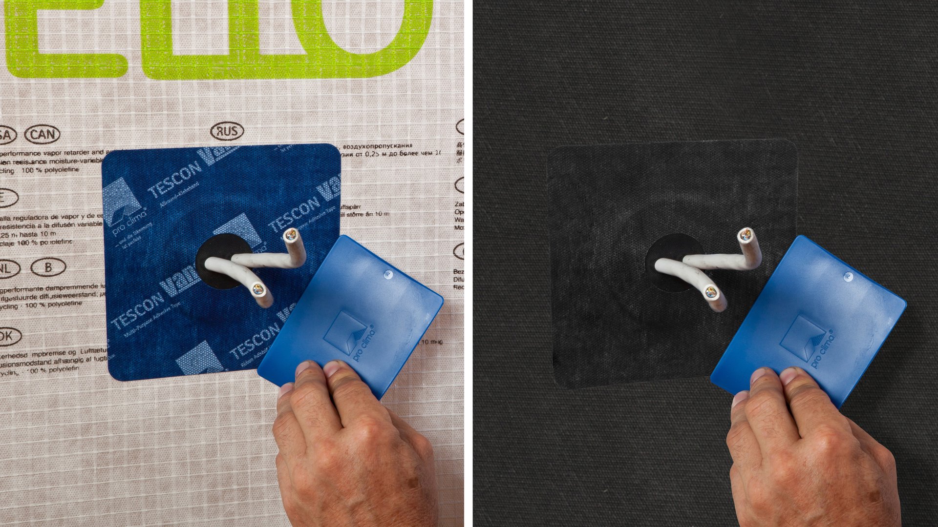 Kabel durch das vorgestanzte Loch im EPDM ziehen, Manschette auf den Untergrund führen und ausrichten.