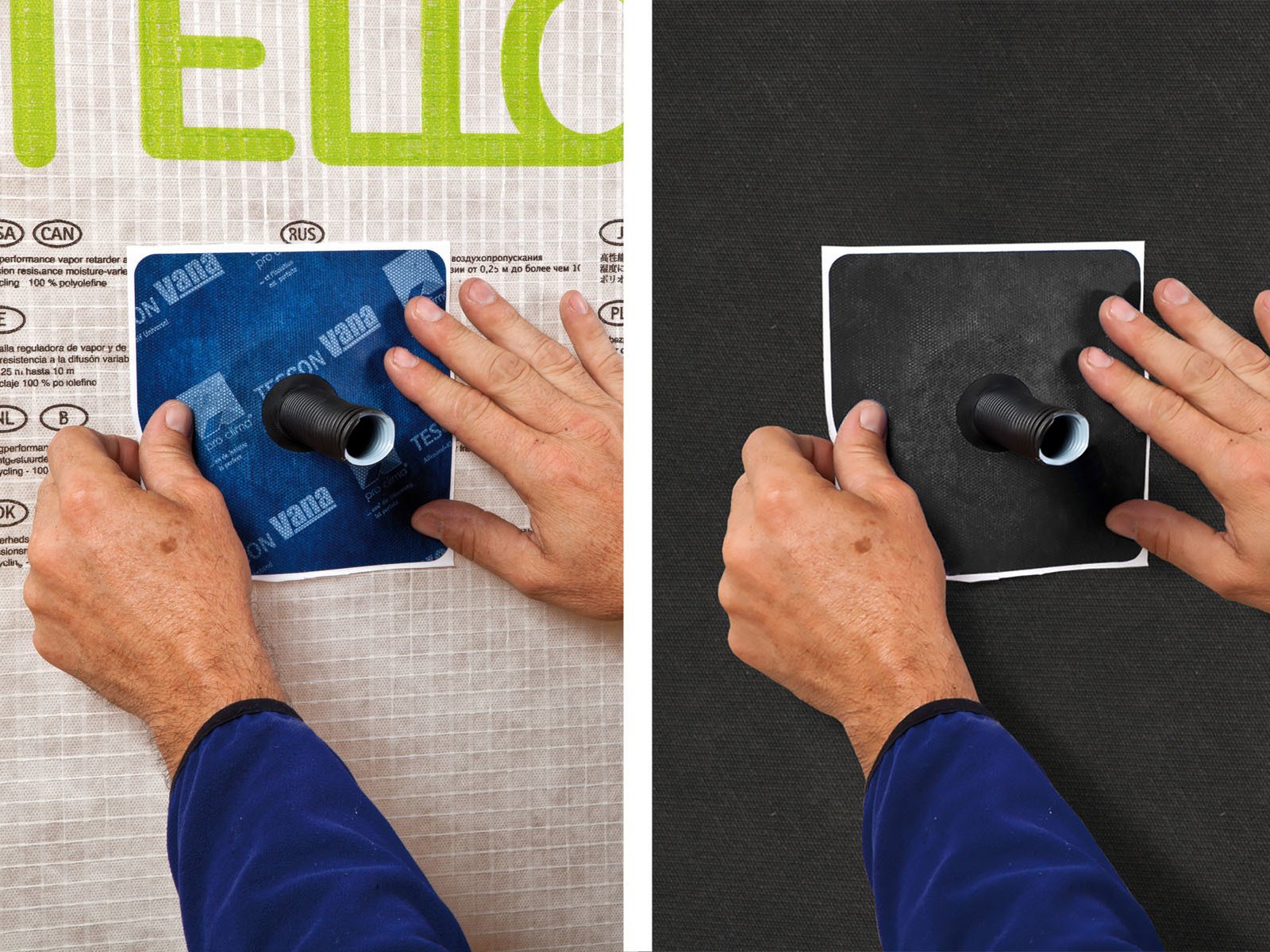 Flächig auf zu dichtenden Untergrund führen, verkleben, fest anreiben.