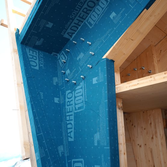 Ein wesentliches Detail der Ausführung war der Schutz der Holzelemente bereits vor der Montage:Die Außenflächen wurden mit SOLITEX ADHERO 1000 vorab geschützt, noch bevor die Wärmedämmung und die äußere Metallverkleidung angebracht wurden.