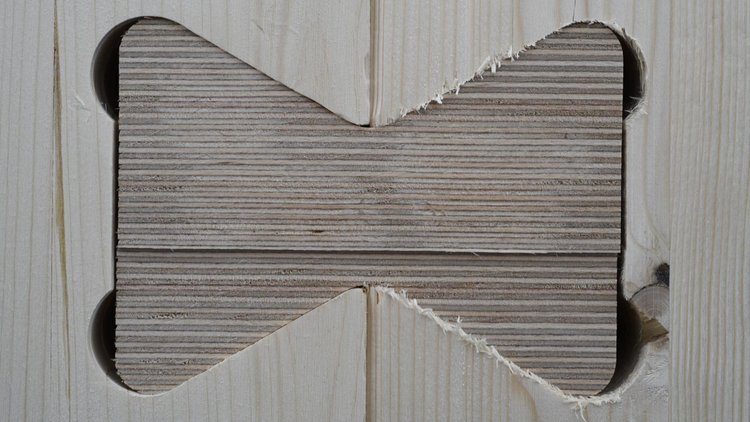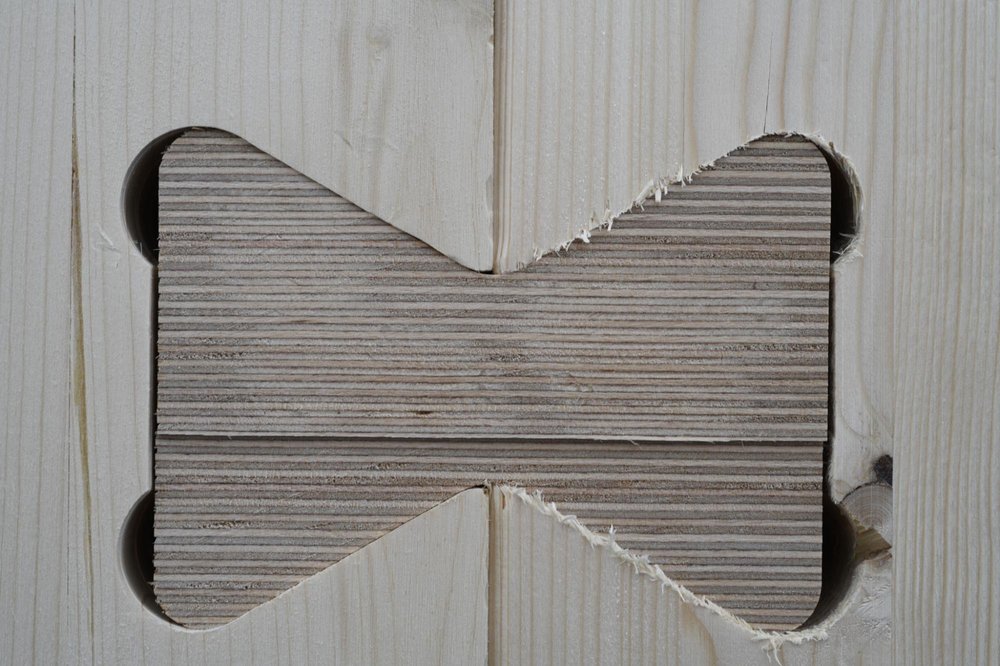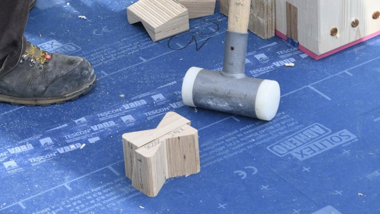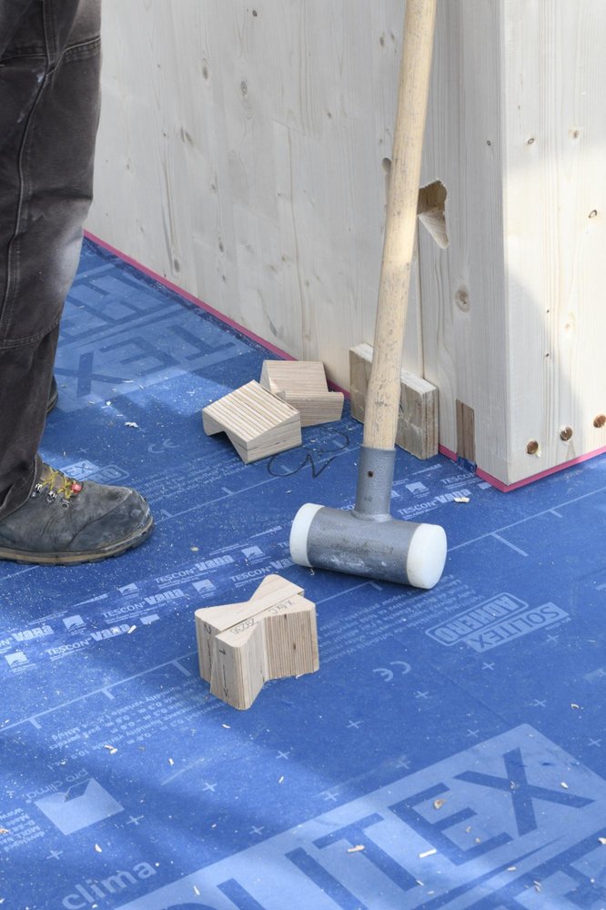 Die Holz-Holz-Verbindungen folgen nicht nur der Prämisse hauptsächlich Holz einzusetzen, sondern bringen auch aus bauphysikalischer Sicht Vorteile mit sich: An diesen Verbindungen kann kein Kondensat entstehen. Sie werden mit Hilfe eines Schonhammers in die dafür vorgesehenen Einkerbungen installiert.