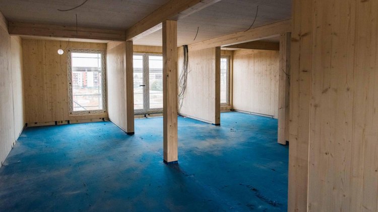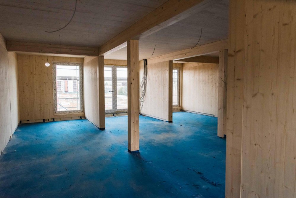 Ein ganz besonderes Raumkonzept: Vorbereitungen für das Einsetzen der flexiblen Trennwände - künftig werden sich die Bewohner zwischen zwei Raumgrößen entscheiden können.