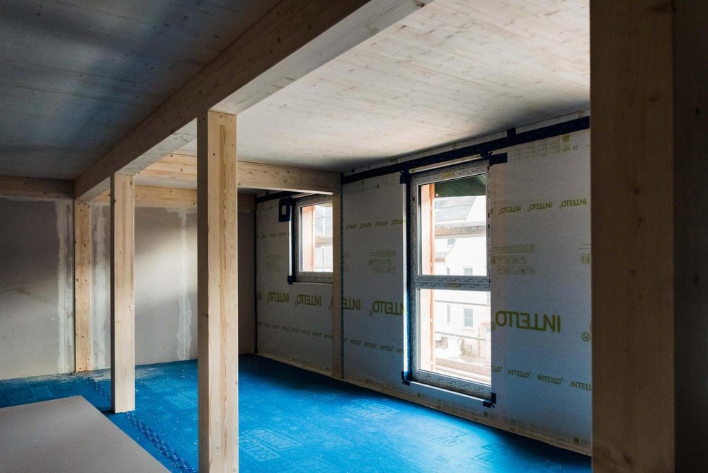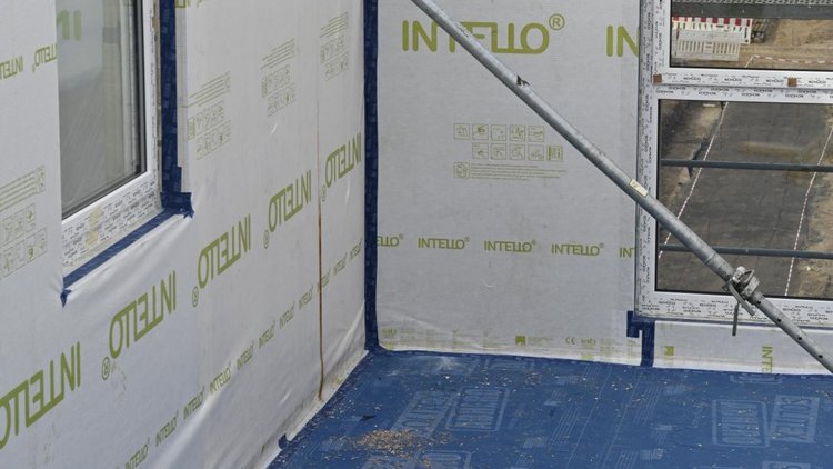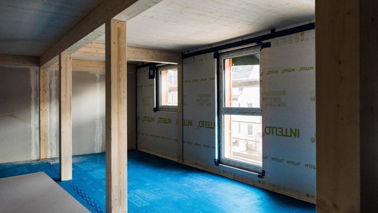 Die Dichtung der Gebäudehülle spielt für den Holzbau eine ganz besondere Rolle. Um den hohen Anspruch an Luftdichtheit zu erfüllen, greift das Bauvorhaben auf die pro clima INTELLO zurück: Diese sorgt für eine sichere Luftdichtung und damit für die Erfüllung des Passivhausstandards sowie der KFW-40-PLUS-Standards.