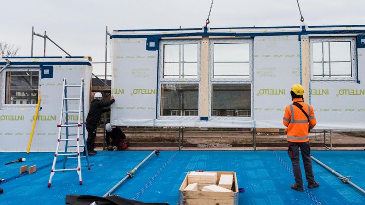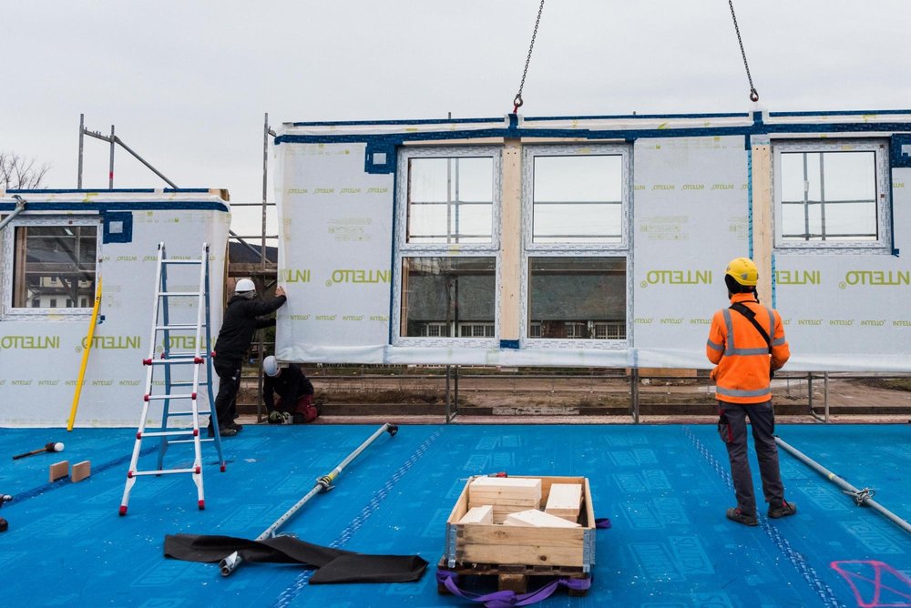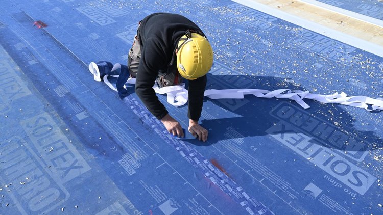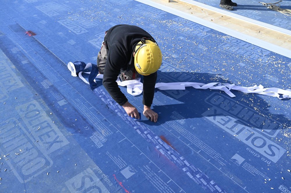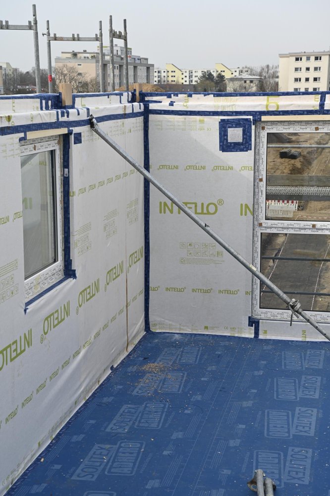 Als Witterungsschutz für die Holzbauteile dient während der Bauphase die SOLITEX ADHERO. Im Anschluss verbleibt sie als dauerhafte Luftdichtungsebene zwischen den einzelnen Nutzungseinheiten direkt im Bauvorhaben.