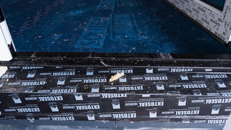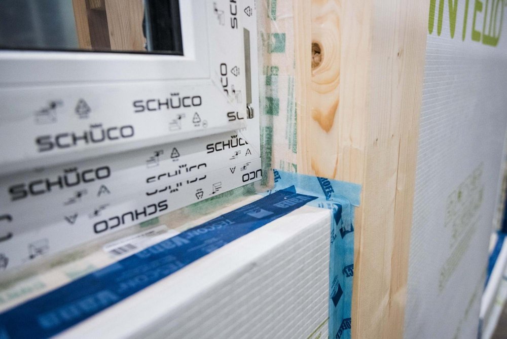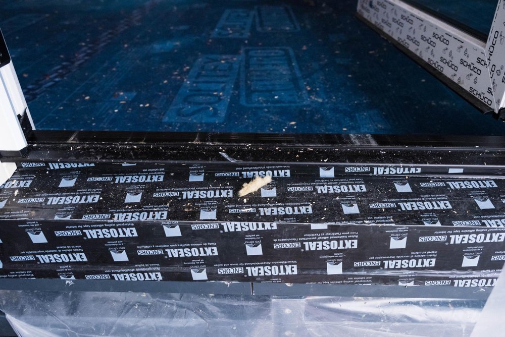 Für die sichere Verklebung der Anschlüsse an Fenstern und Türen wurde das wasserführende Absperrklebeband EXTOSEAL ENCORS eingesetzt. Durch seine hohe Dehnbarkeit kann es flexibel über Ecken verklebt werden und stellt mit seiner nachgewiesenen Schlagregendichtheit einen hohen Bauteilschutz her. Innen an den Fenstern kam das Fensteranschlussband CONTEGA SOLIDO IQ-D und das vorgefaltete Winkelanschlussband TESCON PROFECT für die luftdichte Verklebung zum Einsatz.