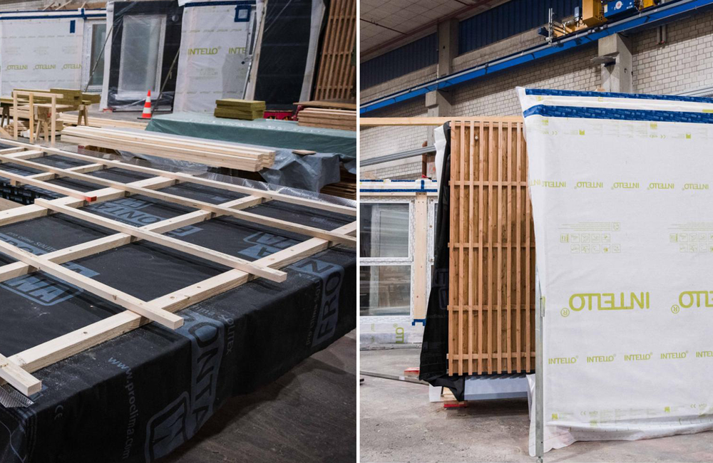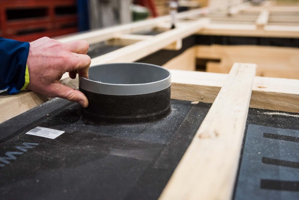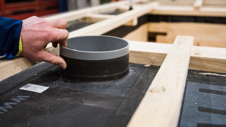 Der hohe Vorfertigungsgrad im Holzbau ermöglichen die Anbringung der intelligenten Luftdichtungsbahn INTELLO sowie der Wandschalungsbahn SOLITEX FRONTA WA bereits im Werk. Auch Detailanschlüsse werden mit Hilfe der pro clima Manschetten vorgearbeitet. Diese dienen der sicheren und dichten Durchführung von Kabeln und Rohren durch die Luft- bzw. Winddichtungsebene. Kombiniert wurden sie hier mit der Wandschalungsbahn SOLITEX FRONTA WA, welche unter der Holzschalung angebracht wird und mit ihrer porenfreien TEEE-Funktions-Membran unerwünschte Feuchte aktiv aus dem Bauteil nach draußen abtransportiert.
