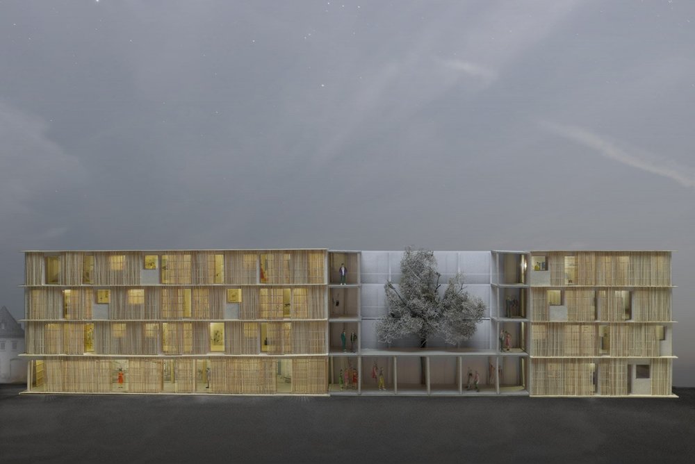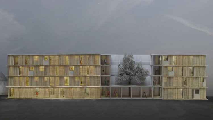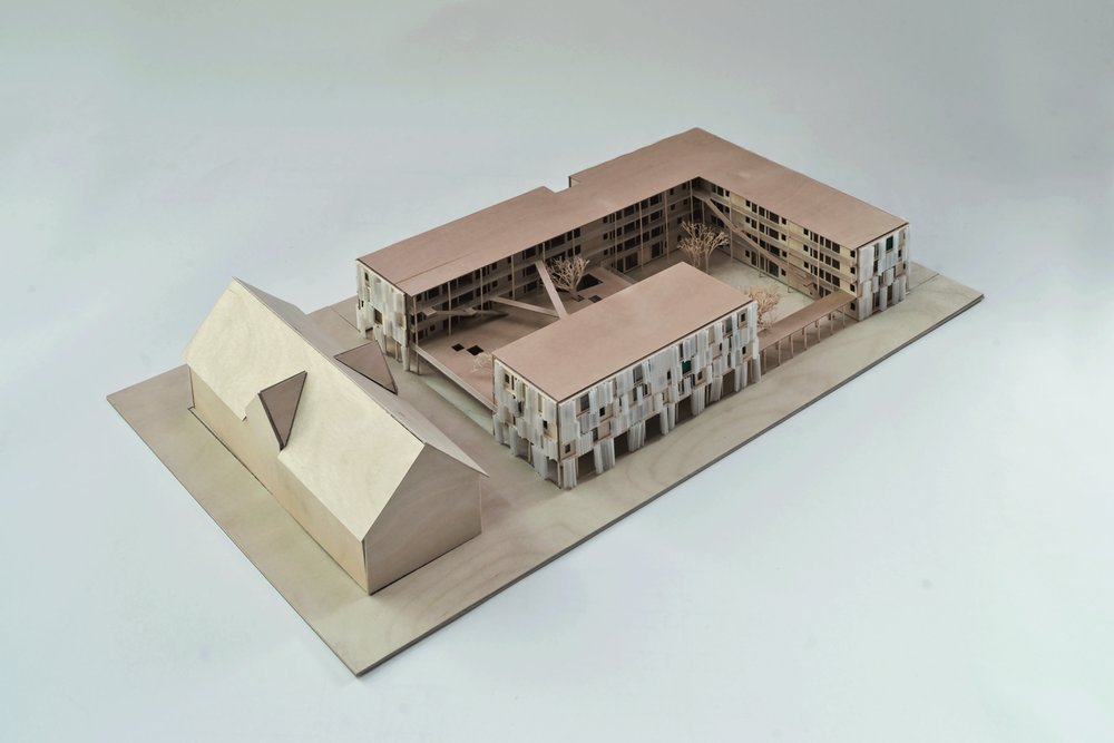 Das Holzmodell von DGJ Architektur GmbH zeigt links das gesamte Gelände mit Alt- und Neubau. Im Erdgeschoss des Neubaus (rechts) laden Aula, Werkstatt und Multifunktionsraum zum Austausch ein, der Dachgarten bietet Raum für Begegnung und Bildung. So entsteht ein Ort, der sozialen Zusammenhalt und kulturelle Teilhabe aktiv fördert. Bild © DGJ Architektur GmbH
