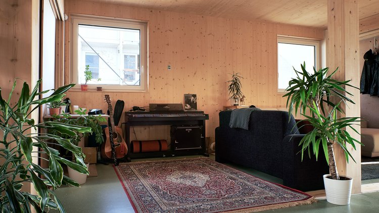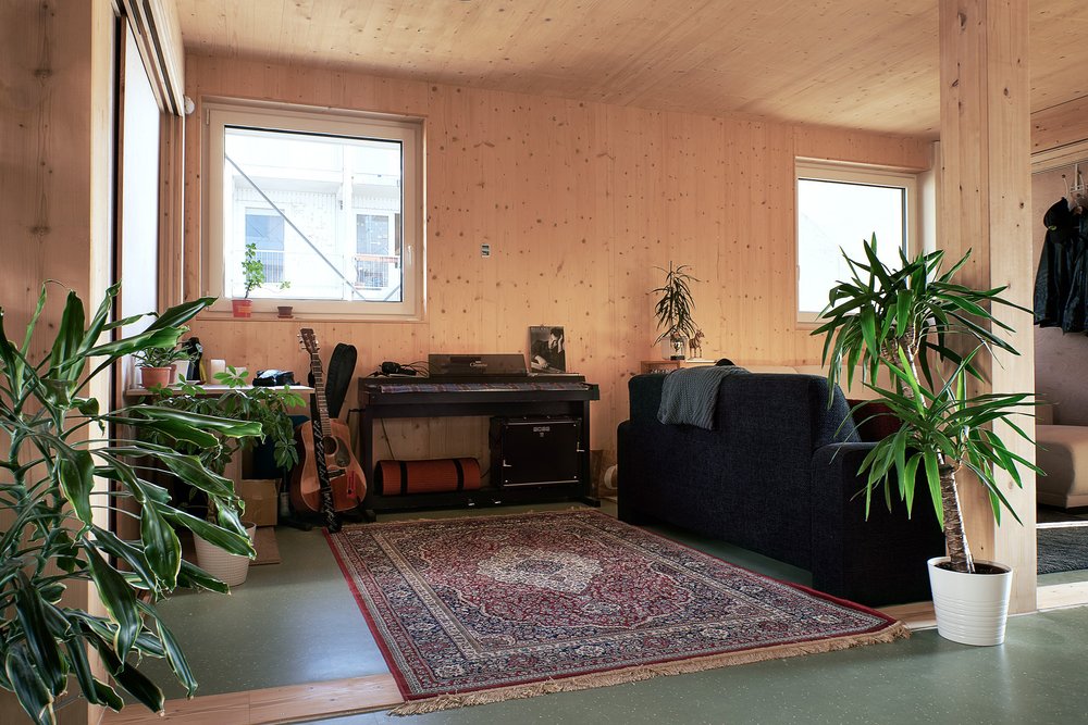 Die Projektgruppe verfolgt ein klares Leitbild: gemeinschaftlich, selbstbestimmt und ökologisch verantwortungsvoll wohnen. So wurde ein flexibles Raumkonzept umgesetzt. Durch gemeinsam mit den Architekten und einem Zimmereibetrieb entwickelte flexible Trennwände können die Bewohnerinnen und Bewohner zwischen zwei Zimmergrößen wählen. Viele Erstbewohner entschieden sich bewusst für die kleinere Variante mit 7 m² – zugunsten von mehr Gemeinschaftsflächen und geteilter Nutzung. Das Prinzip der Suffizienz prägt das Projekt: Weniger Individualfläche, mehr Miteinander. Kleine, flexible Privaträume werden mit großzügigen Gemeinschaftsflächen kombiniert.