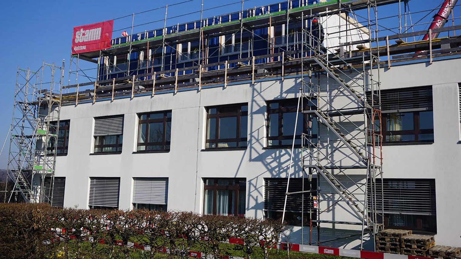 Der Einsatz der SOLITEX ADHERO 3000 ermöglicht einen temporären Bauzeitenschutz auf Zwischendecken von mehrgeschossigen Bauten in Holz- und Holz-Hybrid-Bau.
